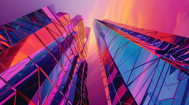Two futuristic skyscrapers in pink and blue, reflecting a vibrant sunset, convey a sense of progress, ambition, and the future.