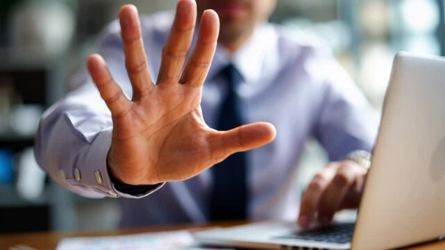 Business Man gesturing "Stop": A determined individual, working diligently on a computer in an office environment, emphatically gestures a halt, expressing a sense of urgency, and assertiveness.