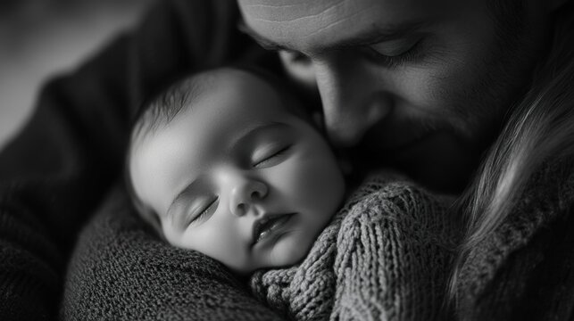 Widescreen medium shot of a newborn nestled in their parent's arms the scene evoking a sense of serenity and reverence