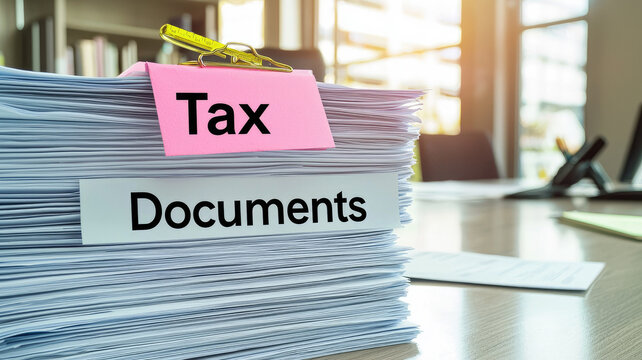 Stacks of tax documents organized on office desk, showcasing importance of financial management and organization. scene conveys sense of professionalism and diligence