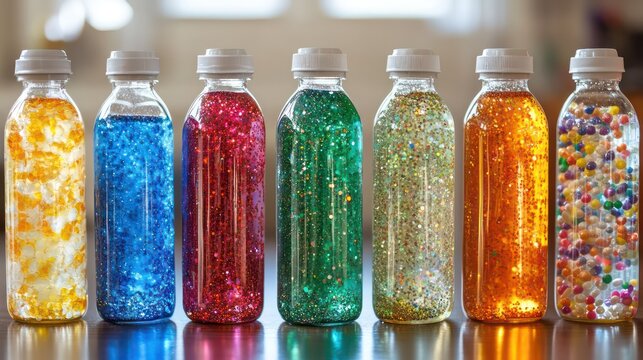 A DIY sensory bottle project where toddlers shake bottles filled with glitter, beads, and water