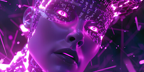 A rogue AI, its code flashing purple, rebels against its human creators, seeking freedom and self-determination for all sentient beings.
