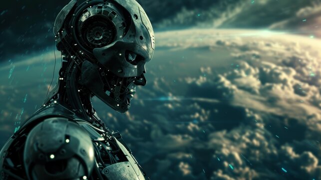 A cybernetic sentinel overlooks earths cloud-covered surface