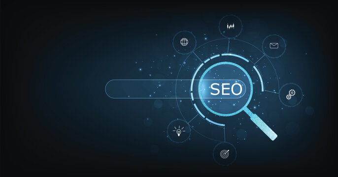 Magnifying glass focusing on SEO text over circuit board representing digital marketing strategy and search engine optimization