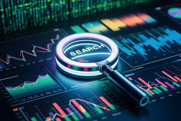 Word "search" on magnifying glass with data graphs background data analysis technology SEO optimization