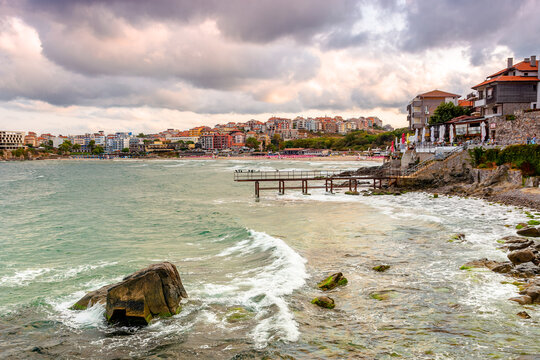 sozopol, bulgaria - 05 sep 2019: embankment of the ancient resort town by the sea at sunset. cloudy sky