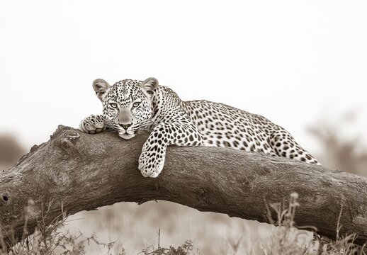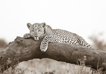 Serene Leopard Resting on a Branch in a Soft Sepia Tone Landscape, Captivating Wildlife Scene in Natural Habitat
