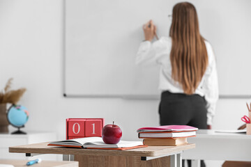 Calendar among books against the background of the chalk board. Concept for Knowledge Day, beginning of the school year. Copy space.