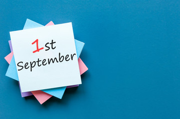 Blank notebook, stationery and calendar with date SEPTEMBER 1 on pink background