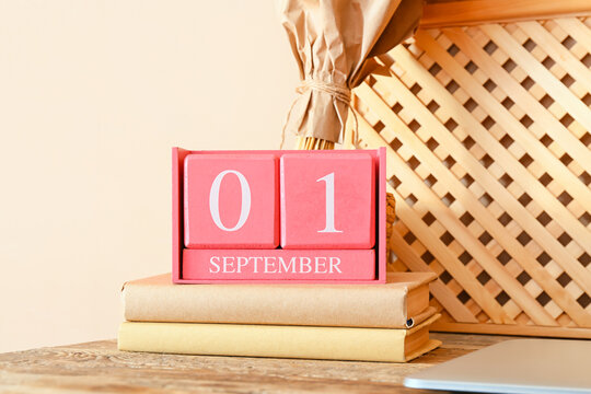 Cube calendar with date SEPTEMBER 1 and books on table in room, closeup