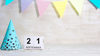 Birthday September 21  on the calendar. Happy birthday card with date copy space. Holiday decorations for congratulations, place for text.