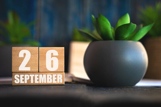 september 26th. Day 26 of month, Cube calendar with date and pot with succulent placed on table at home Simple calendar. autumn month, day of the year concept