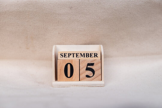 September 5th. Image of September 5 wooden color calendar on white canvas background. empty space for text