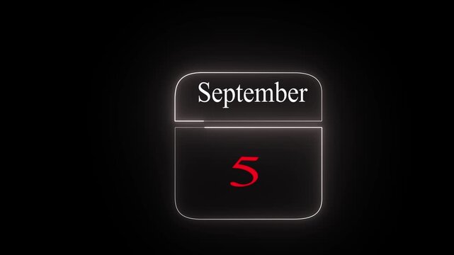 Glowing neon 5 September DAY icon white color isolated on black background neon sign with a calendar that says "5 DAYS". HD Video motion graphic 4k animation video