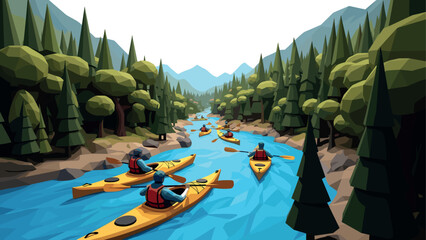 Low poly kayaking adventure in serene forest river landscape with mountains