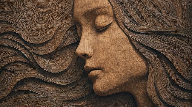 Carved wooden art depicting a serene face with flowing, wavy hair in detailed relief