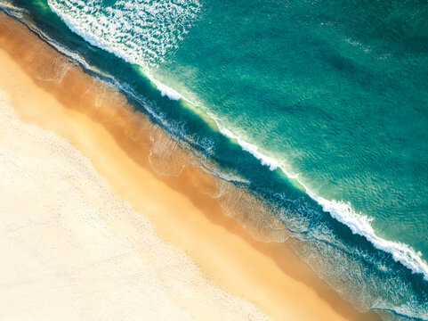 Aerial view of beautiful beach with clear blue water and calming waves, Port Noarlunga, South Australia, Australia.