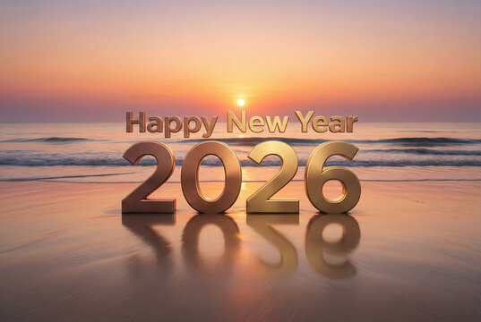 New Year 2026 written in sand on a beach, with gentle waves lapping at the shore, capturing the essence of celebration and new beginnings in a serene coastal setting