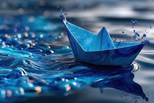 A paper boat on a sandy beach with a sea background, with beige and blue tones.