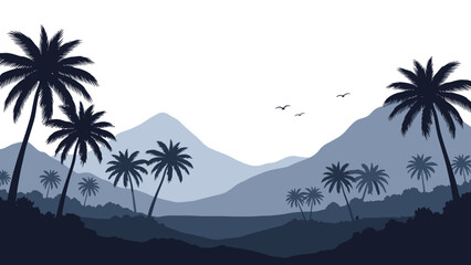 Tropical Palm Trees Silhouette with Mountains and Birds in Blue Tones