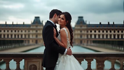 Paris, France, Europe. A bride and groom pose on a balcony overlooking a serene water body. The bride wears a white lace wedding dress with a fitted bodice and a full skirt.