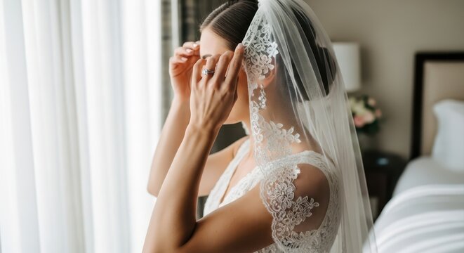 Elegant bride adjusting delicate lace wedding veil in soft morning light by window