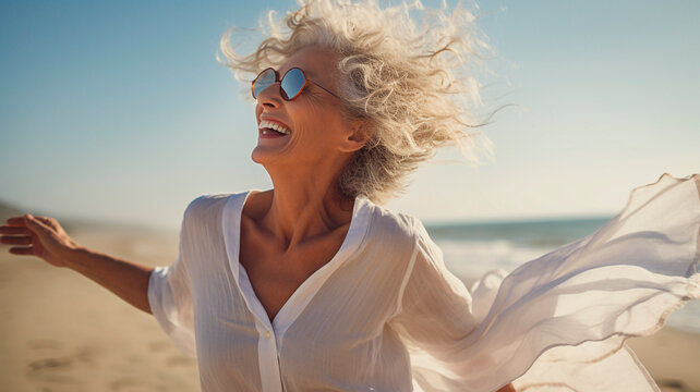 Joyful rhythms on the beach: image of happy dancing mature woman at the beach, Generative AI