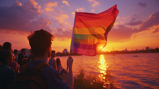 A group of young individuals at a lakeside gay pride celebration the rainbow flag catching the breeze