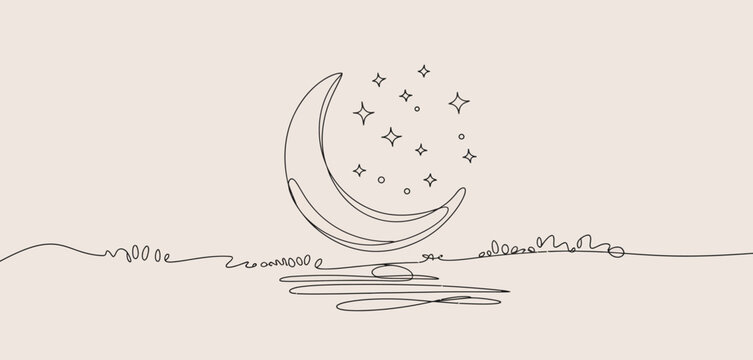 Crescent Moon and Stars Night Sky One Line Art Minimalist