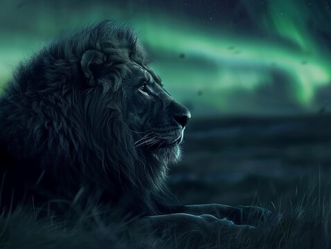 Regal lion, aurora halo, midnight plains, serene gaze, ethereal glow, Hyper realistic