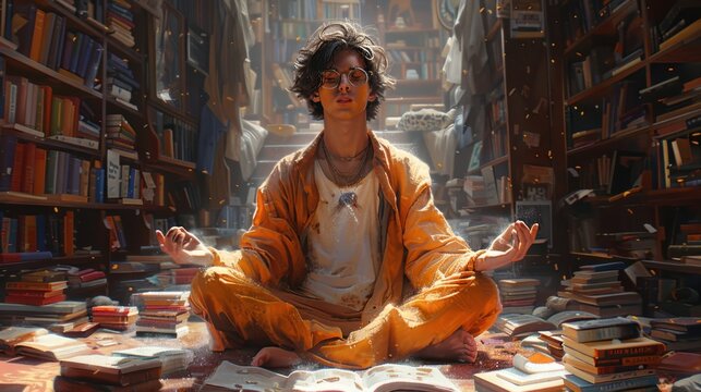 a smart guy with glasses and bright clothes engaging in meditation in a brightly lit library setting, with books lining the shelves, representing the pursuit of knowledge and enlightenment