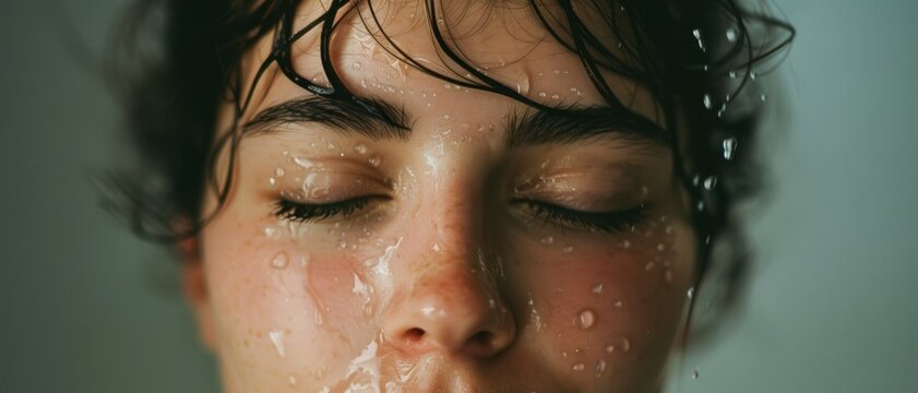 Radiant woman demonstrating skincare routine touching face enjoying self-care natural beauty with eyes closed beautiful complexion serene expression gentle touch peaceful calm