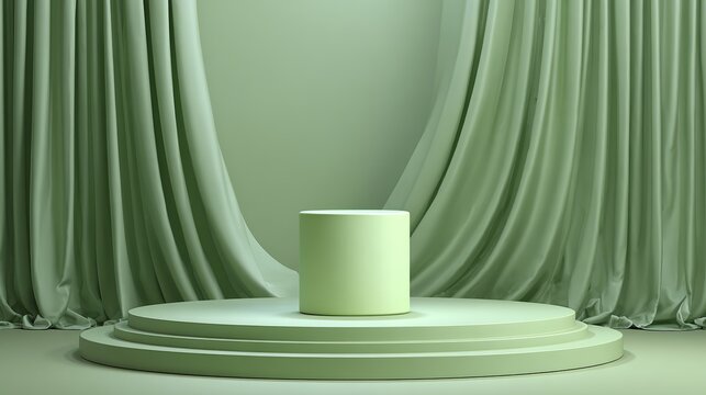 Elegant sage green product podium stage with draped fabric backdrop for contemporary marketing displays and showcases.