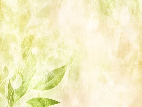Soft Spring Greens: An ethereal watercolor-style background featuring delicate green leaves on a soft, pastel backdrop of yellow and beige hues, creating a serene and calming atmosphere.