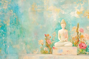 Serene Buddha Statue with Floral Accents on Teal Background