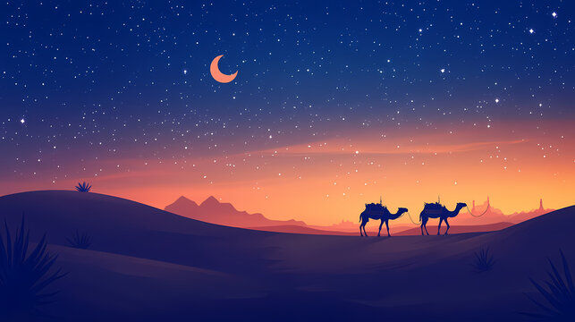 A serene desert night with a camel caravan under a starry sky and crescent moon. ideal for ramadan designs, travel promotions, or tranquil nature themes. Desert Caravan Under Stars. Illustration
