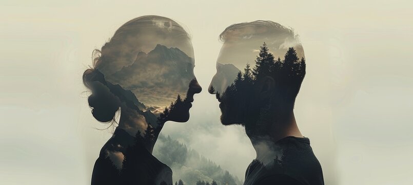 Surreal double exposure of woman and man heads merged with peaceful forest backdrop