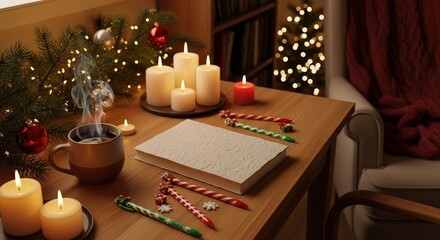 Cozy Christmas scene with a blank notebook, steaming mug, and glowing candles on a wooden desk.
