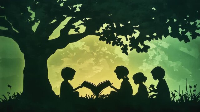 Silhouette of four children sitting under a tree at nighttime, each holding a book and reading. A serene scene symbolizing the love for books and learning.
