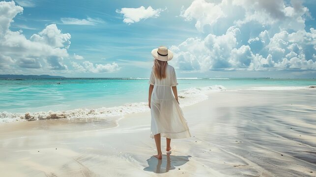 serene woman walking on tropical beach lifestyle back view photograph