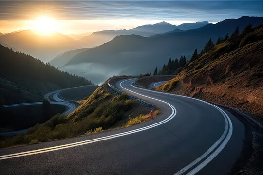 Dramatic sunset view from the car on a winding mountain road during an adventurous road trip journey through the scenic landscape