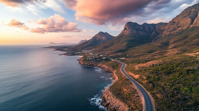 The aerial view of Oudekraal Nature Reserve near Cape Town, South Africa reveals a stunning landscape where a winding road gracefully traces the rugged mountain contours.