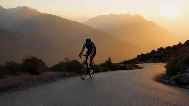 Cyclist navigates winding mountain road at sunset in serene outdoor landscape