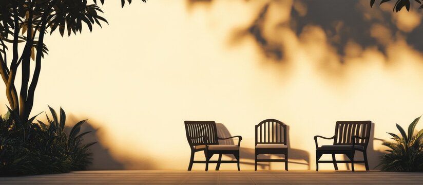Sunlit courtyard with silhouette of patio furniture creating a serene atmosphere and blank space for customizable text or branding.