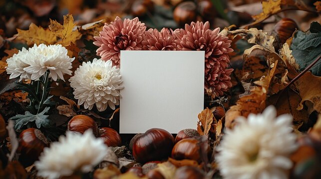 A serene autumn scene featuring flowers, leaves, and a blank card for customizable text and notes.