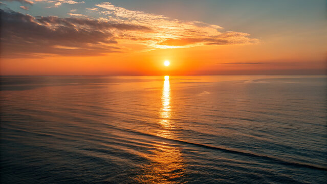 A serene ocean sunset scene with the sun positioned exactly on the horizon line, glowing bright golden-orange. Calm sea water with subtle ripples reflecting warm sunlight. Sky features a smooth gradie
