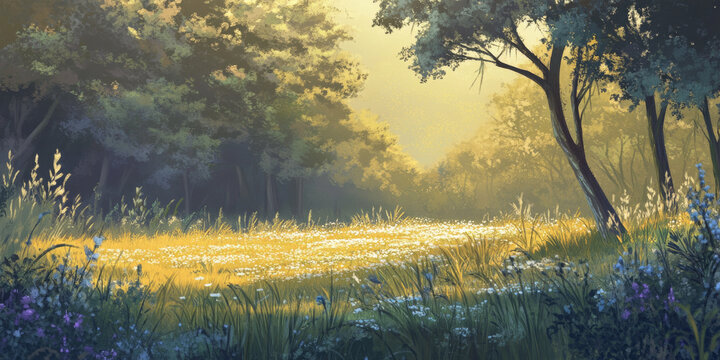 A tranquil meadow at dawn with dew-covered grass, wildflowers swaying in the breeze, and soft golden light bathing the landscape. The serene scene feels rejuvenating and fresh.