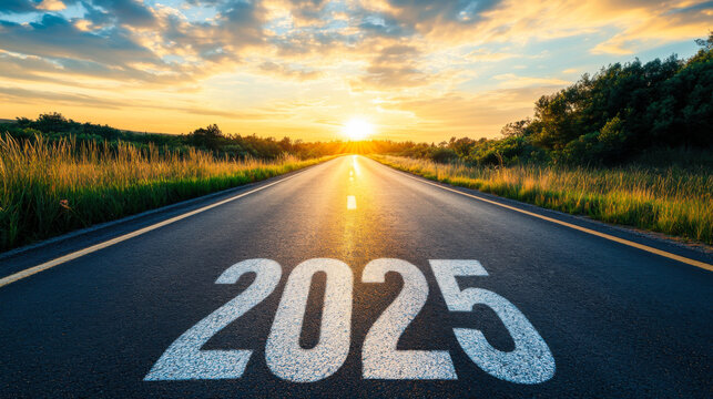 A serene sunrise over a straight road marked by the year 2025 in a rural landscape, highlighting the promise of a new beginning