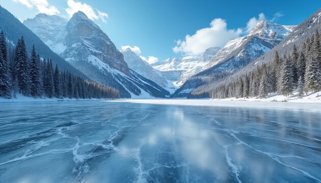 Frozen lake mirrors snow capped mountains and pine forest. Vast icy expanse under clear blue sky. Serene winter wilderness scene in daytime.