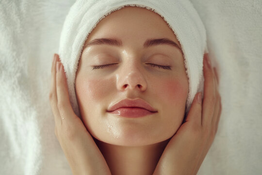 A woman enjoys a facial treatment in a serene spa environment, surrounded by soft towels and calming lighting, promoting relaxation and rejuvenation
